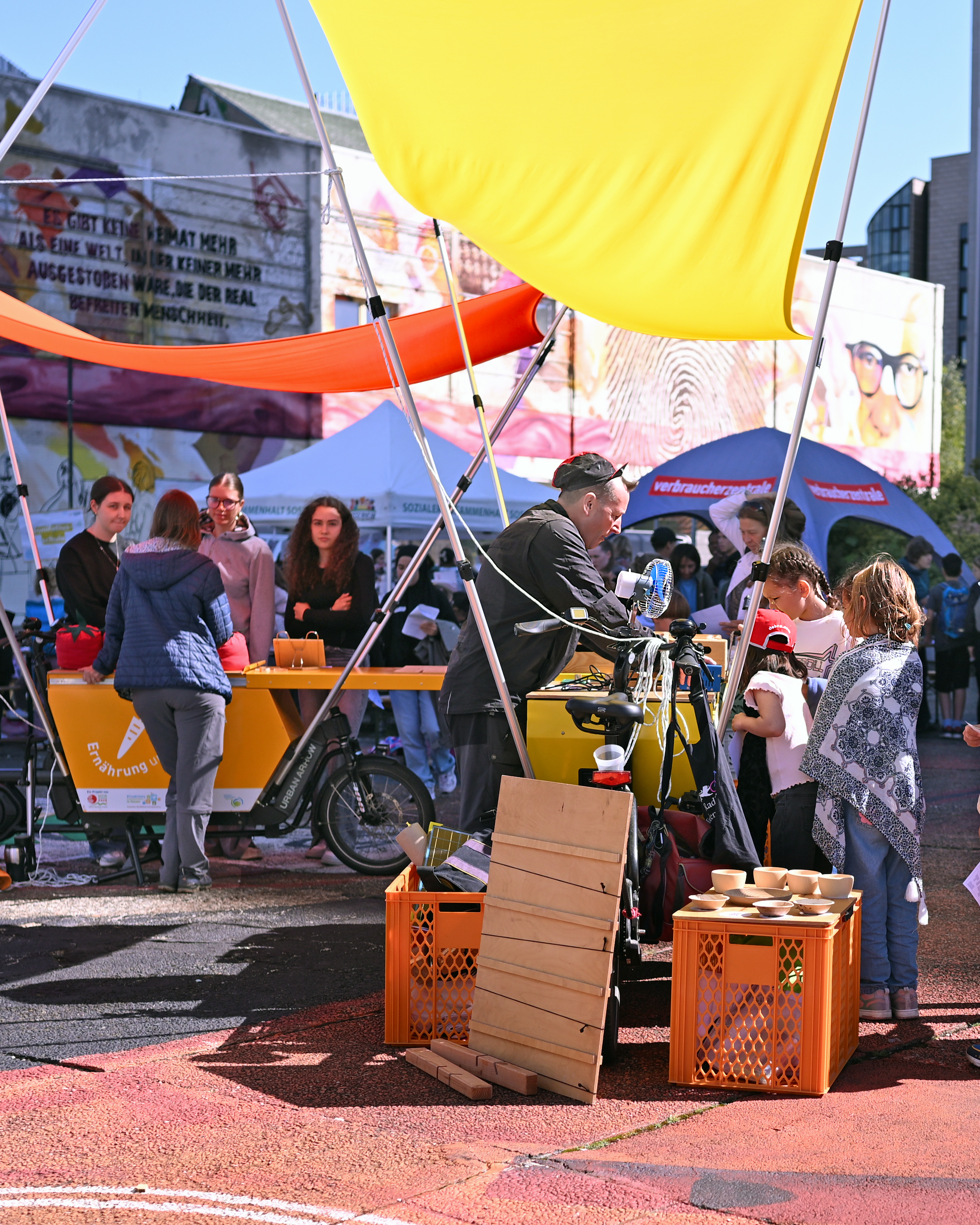 In den Fokusstadtteilen Bockenheim und Fechenheim werden niedrigschwellige, handlungsorientierte Bildungsformate angeboten – ob beim Einkaufen, im Stadtteilfest, in Schulen oder Kitas. Im Mittelpunkt stehen Alltagsfragen wie Hitzeschutz im Sommer, Heizung im Winter, gesunde Ernährung oder Zusammenarbeit in der Nachbarschaft. Für die Umsetzung der Bildungsangebote baut die Klimabildungslandschaft Frankfurt auf eine enge Zusammenarbeit mit den Quartiersmanagements, lokalen Unternehmen, Vereinen, Initiativen und engagierten Menschen. Regelmäßige Klimabildungstreffs fördern neue Ideen und Kooperationen – mit Unterstützung der Koordinierungsstelle.