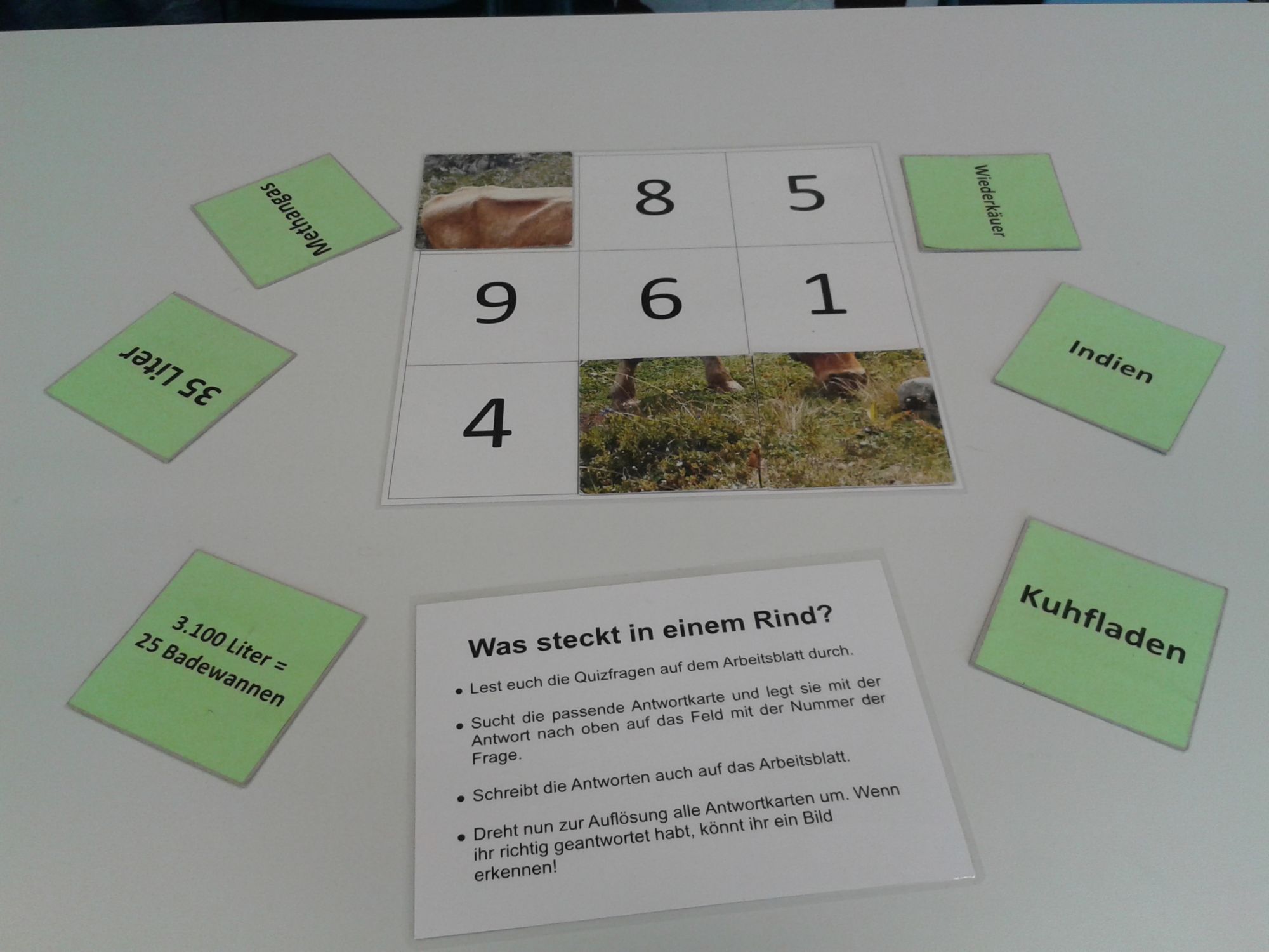 Die Erfahrungen aus den Stationen werden gemeinsam diskutiert. Die Schülerinnen und Schüler entwickeln konkrete Handlungsoptionen für eine gerechte und nachhaltige Ernährung und halten diese auf beschriebenen Papierhänden, sogenannten Handprints fest. Abschließend werden die neuen Erkenntnisse bei einem Wissensquiz spielerisch überprüft. Eine oder mehrere der erarbeiteten Handlungsoptionen können später in einem Klassenprojekt vertieft werden.
