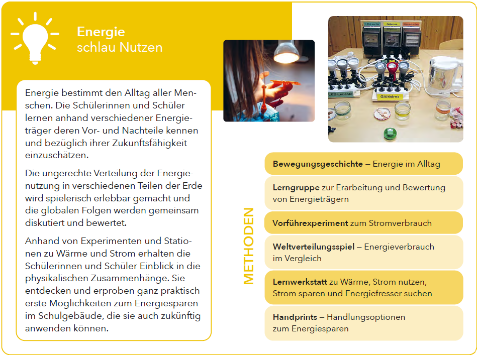 Energie bestimmt den Alltag aller Menschen. Die Schülerinnen und Schüler lernen anhand verschiedener Energieträger deren Vor- und Nachteile kennen und bezüglich ihrer Zukunftsfähigkeit einzuschätzen.