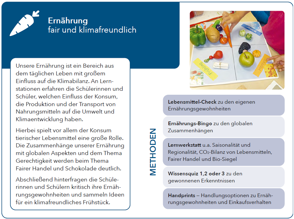 Unsere Ernährung ist ein Bereich aus dem täglichen Leben mit großem Einfluss auf die Klimabilanz. An Lernstationen erfahren die Schülerinnen und Schüler, welchen Einfluss der Konsum, die Produktion und der Transport von Nahrungsmitteln auf die Umwelt und Klimaentwicklung haben.