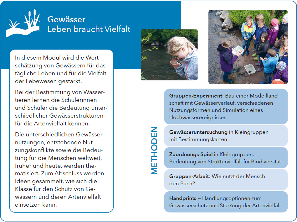 In diesem Modul wird die Wertschätzung von Gewässern für das tägliche Leben und für die Vielfalt der Lebewesen gestärkt.